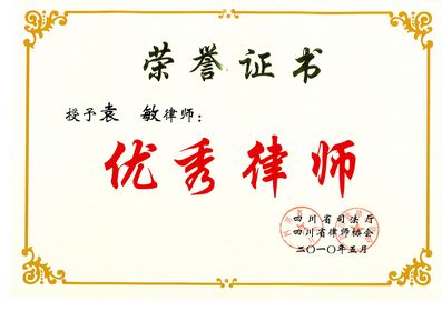 2010年5月我所袁敏律师荣膺“四川省优秀律师称号”,袁敏在多年法律服务工作中,工作作风严谨,有执着的敬业精神、精深的专业修养、精湛的法律服务技能;恪守律师职业道德和执业纪律,坚持依法诚信执业,受到了行业和社会各界广泛好评。