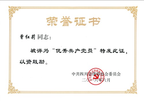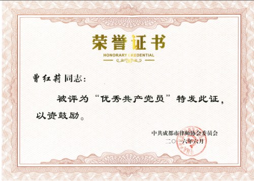 在庆祝中国共产党成立95周年之际,我所党支部被中共成都律协委员会评为“先进基层党支部”,我所曾红莉律师分别获得中共四川省律协委员会“优秀共产党员”及中共成都市律协委员会“优秀共产党员”。 一直以来,我所始终保持谦虚谨慎,戒骄戒躁的优良传统,努力实践“做合格共产党员,当公益服务先锋”的目标,继续在律师工作中当先锋,作表率,以更加坚定的党性,更加务实的作风,更加强烈的使命感和责任感开拓进取。