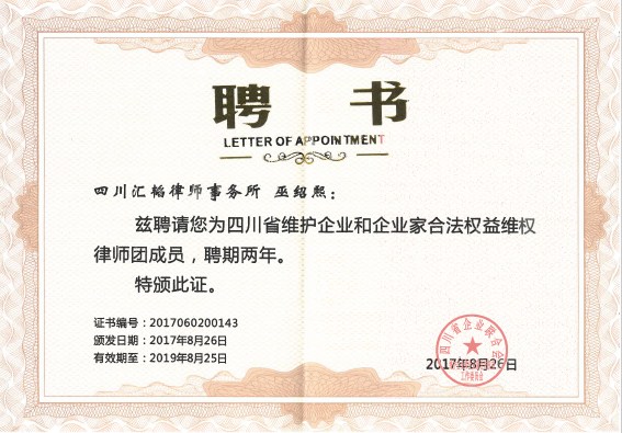 我所成为四川省企业联合会维护企业与企业家合法权益维权律师团合作律师机构