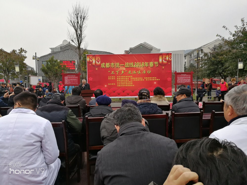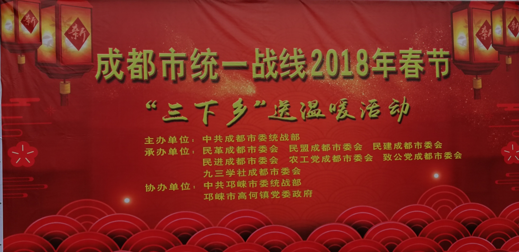 2018年2月1日,由中共成都市委统战部牵头主办,民建成都市委会、民革成都市委会、民盟成都市委会、民进成都市委会、农工党成都市委会、致公党成都市委会、九三学社成都市委会承办,中共邛崃市委统战部、邛崃市高何镇党委政府协办,组织了以上民主党派的部分律师、华西医疗专家、书法家,冒着严寒来到邛崃市高何镇,实施了“三下乡”送温暖活动。中共成都市委统战部副部长、上述民主党派市委会领导、中共邛崃市委统战部长、邛崃市党委政府领导参加了送温暖活动。