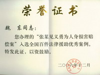 The honorary certificate is conferred on Mr. Weidong and Mr. Li Qijun by Chinese Justice Ministry on "100 law aid cases"